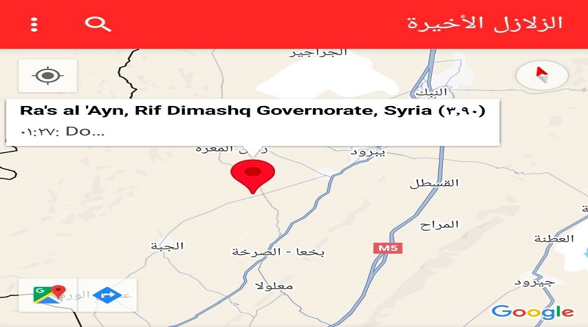 وذكر المركز الوطني للزلازل في بيان على فيسبوك، أن محطات المركز سجلت عند الساعة 01:27 هزة أرضية متحرضة بعمق 8.8 كم غرب مدينة يبرود الواقعة شمال شرق مدينة دمشق، دون تسجيل أي خسائر مادية أو بشرية في المنطقة.